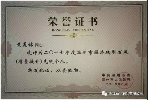 近日,中共溫州市委、溫州市人民政府聯(lián)合發(fā)布《關(guān)于表彰2017年度溫州市經(jīng)濟(jì)轉(zhuǎn)型發(fā)展先進(jìn)集體和先進(jìn)個人的通知》,浙江石化閥門有限公司副總經(jīng)理黃美林榮獲溫州市2017年度經(jīng)濟(jì)轉(zhuǎn)型發(fā)展質(zhì)量提升先進(jìn)個人。